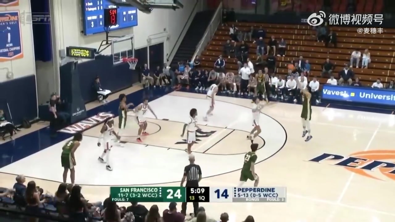 01月11日讯 NCAA常规赛,旧金山大学在客场对阵佩珀戴因大学。上半场结束,旧金山大学以32-21领先。